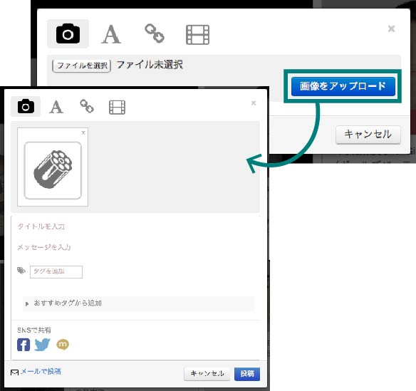 自分のFacebook/Twitterアカウントに同時投稿も可能です。